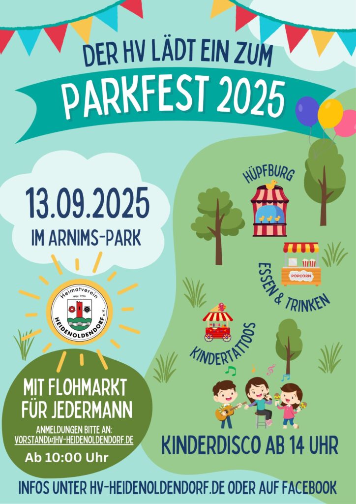 Der Heimatverein Heidenoldendorf e.V. freut sich auf das traditionelle Parkfest in Arnims Park und lädt alle Dörfler und auch Städter herzlich in unseren schönen Park ein. Alle Flohmarktinteressierten melden sich bitte kurz bei uns unter der Emailadresse vorstand@hv-heidenoldendorf.de an. In der Woche des Parkfestes kommen auf unserer Homepage mehr Details bzgl. Stellplätzen, Auf- und Abbau als auch Anfahrt zum Park.