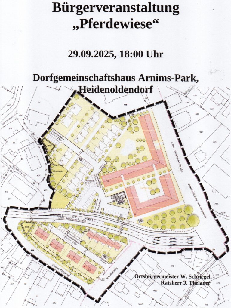 Die Stadt Detmold lädt ein zu einer Informationsveranstaltung zur Bebauung der „Pferdewiese“ im Zentrum von Heidenoldendorf am Donnerstag, den 28.11.2024 um 18 Uhr im großen Saal des Dorfgemeinschaftshauses in Arnims Park. Einlass ab 17 Uhr.